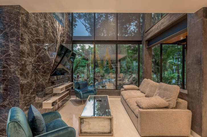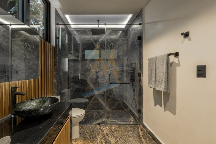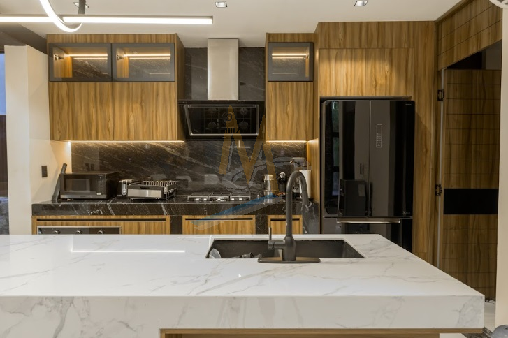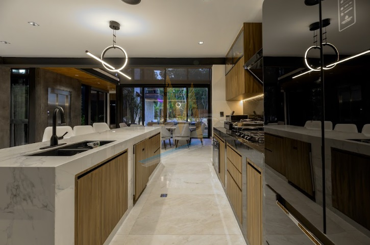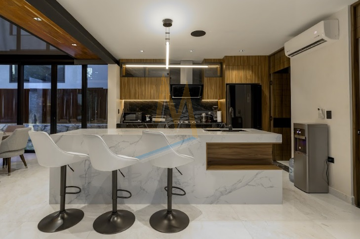 * Primer nivel: Recámara con baño completo y acceso a jardín, cuarto de lavado, cocina equipada con isla central y cubiertas en mármol, sala y comedor con techos de doble altura, entrada principal con cascada.