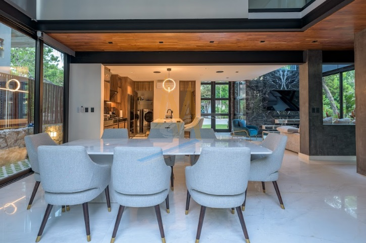 La casa cuenta con elevador, paneles solares y 2 espacios de estacionamiento, está diseñada y decorada con finos acabados en mármol y granito, con una ambientación de elegancia y grandeza.