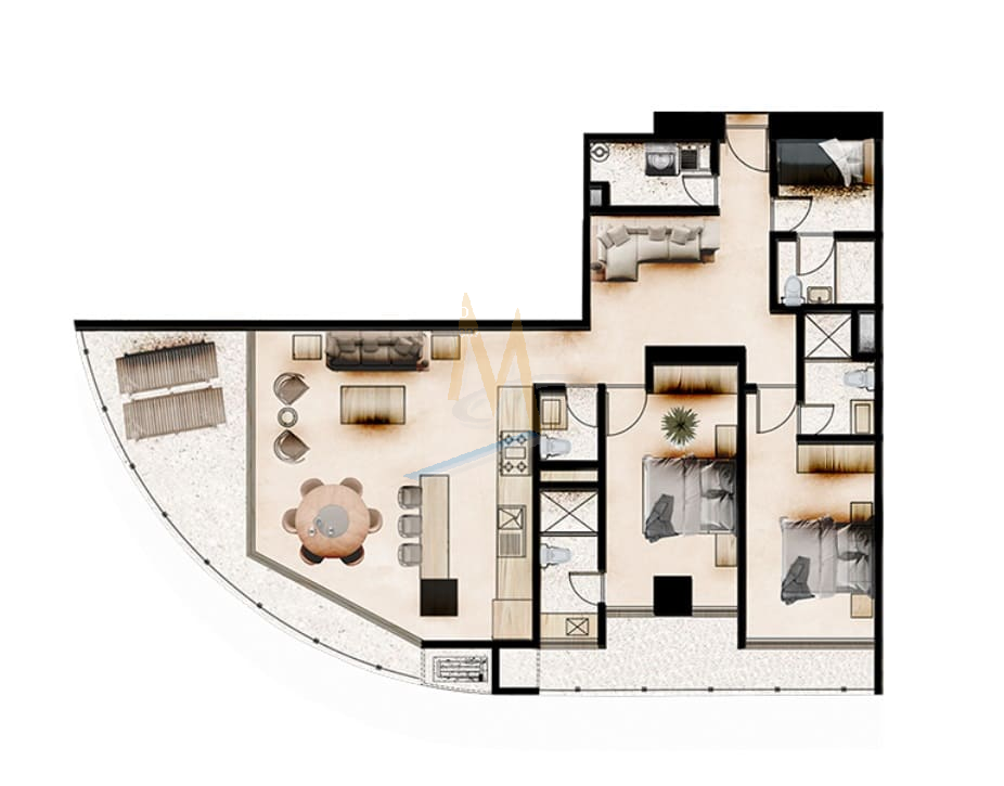 El departamento se ubica en lujoso desarrollo en la ciudad de Cancún, cuenta con 2 recámaras con baño completo cada una, 3.5 baños, área de sala, comedor, cocina, área de TV, terraza con vistas panorámicas, cuarto de servicio con baño, área de servicio y estacionamiento para 1 auto.