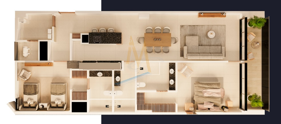 Este departamento se ubica en el nivel 7, cuenta con 2 amplias recámaras, cada una con baño completo y vestidor, la principal con acceso directo a amplia terraza de 12m2 desde la cual se tienen vistas maravillosas, cocina con barra, área de lavado, baño completo de visitas y espacio de sala - comedor.