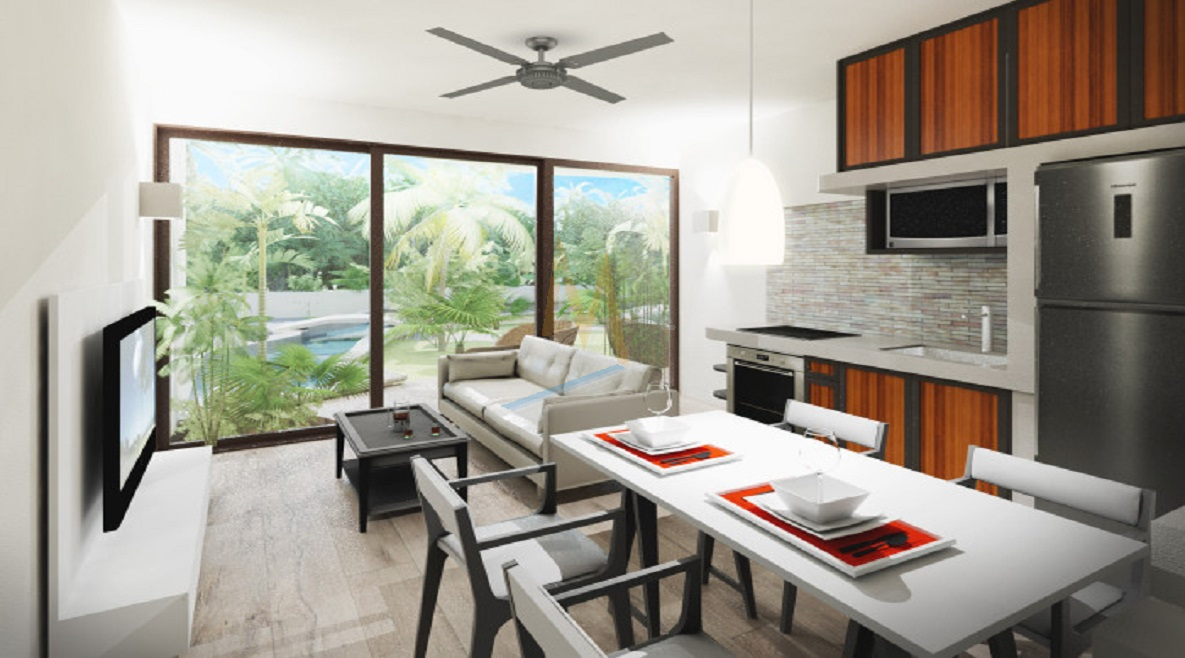 En venta departamento en Tulum. Cuenta con una recámara, 1 baño, sala, cocina,comedor, a/c, terraza, área de lavado, estacionamiento para 1 auto.