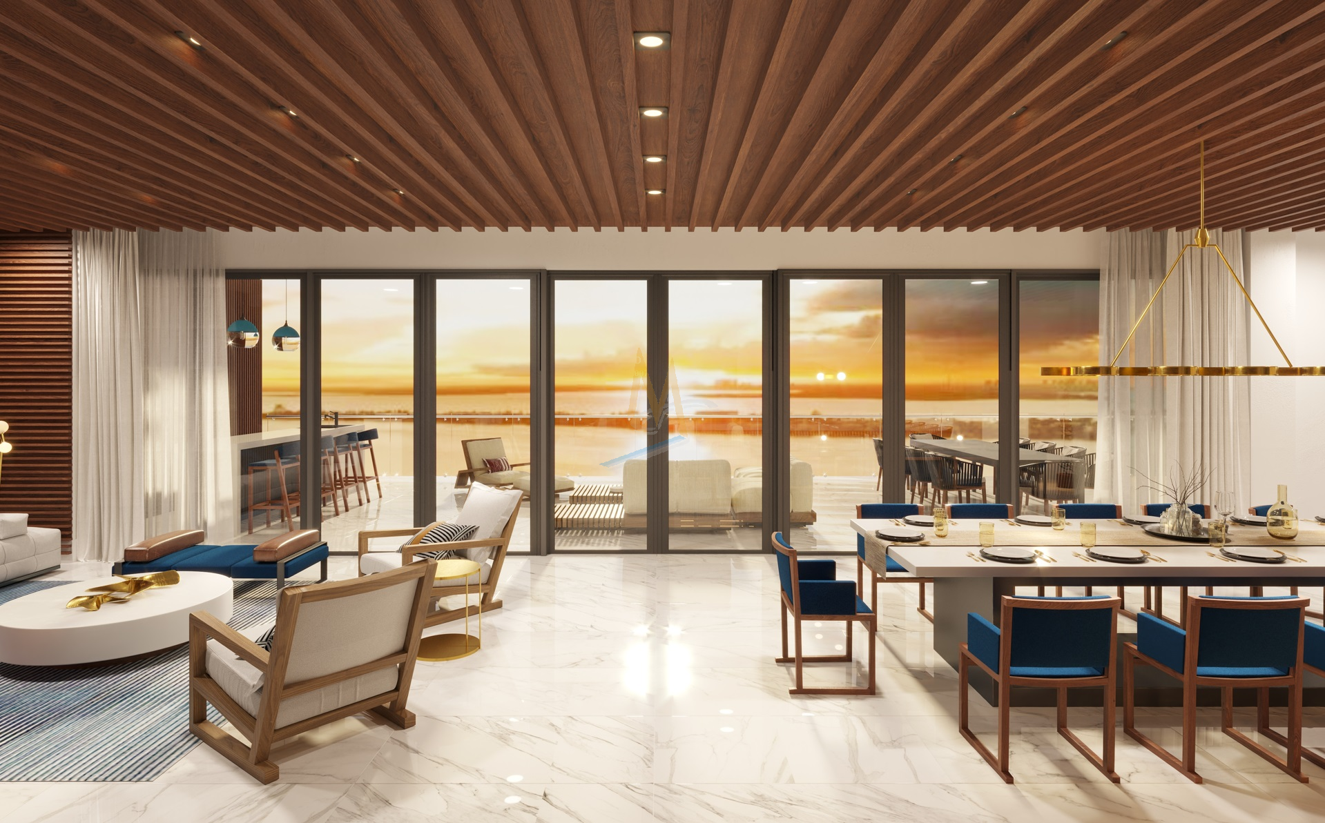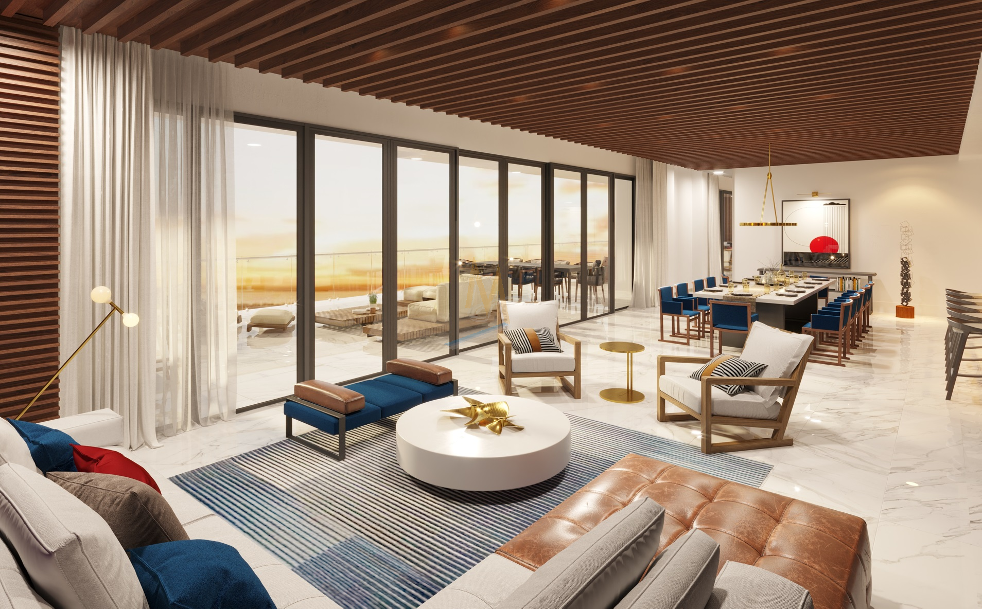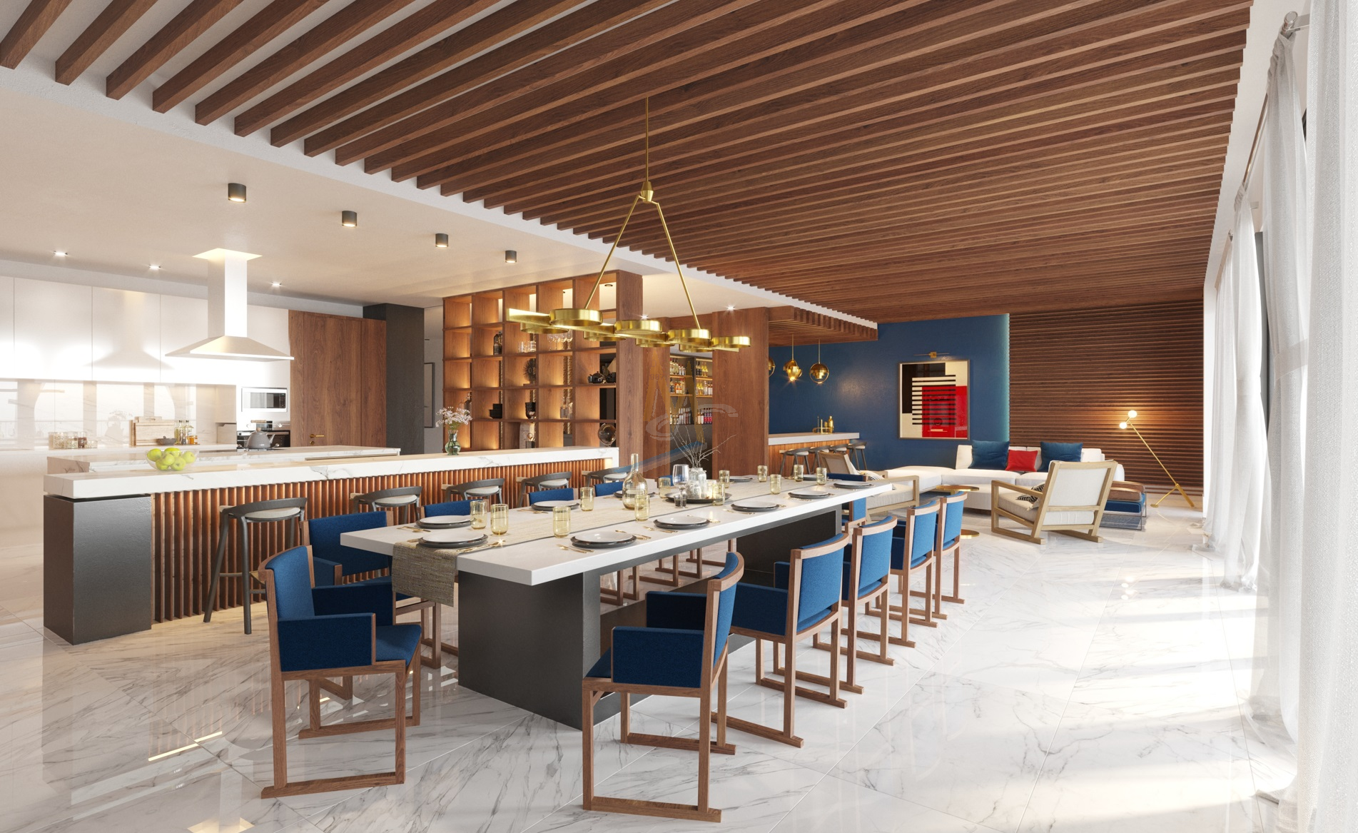 El departamento cuenta con 3 recámaras con baño completo y walk-in closet, cuarto de TV con baño completo, sala, comedor, cocina, alacena, terraza con vista a laguna Bojorquez, terraza con vista a laguna Nichupte, lavanderia, cuarto de servicio, 4 cajones de estacionamiento, jardín privativo de 172 m2 y bodega.