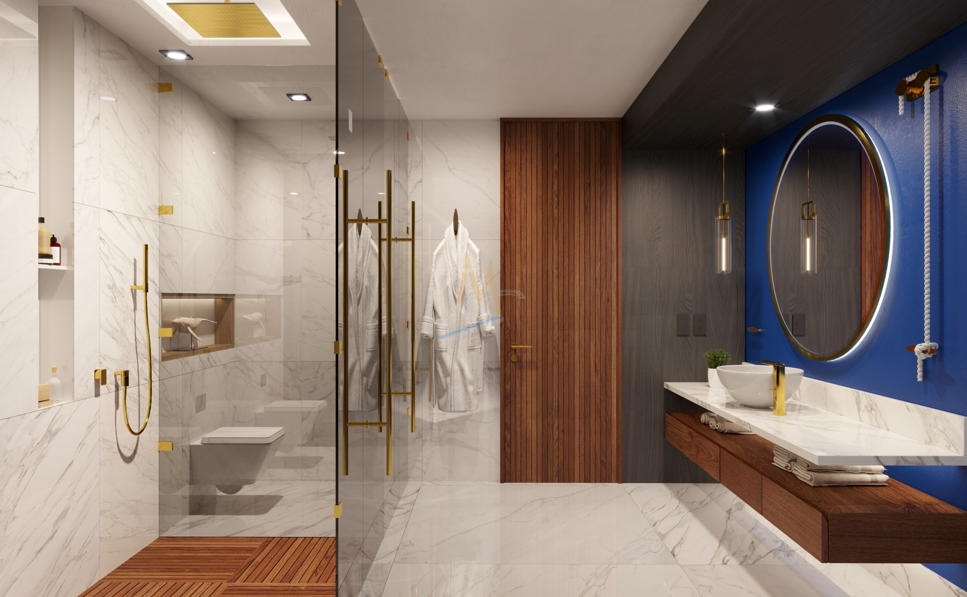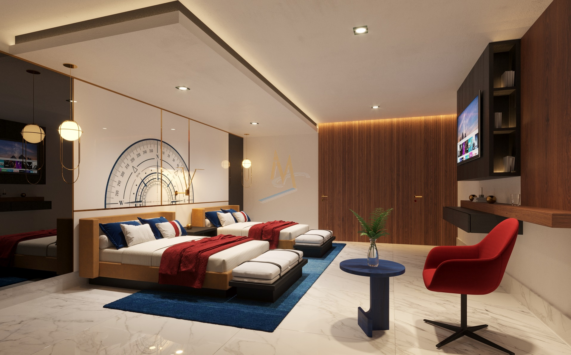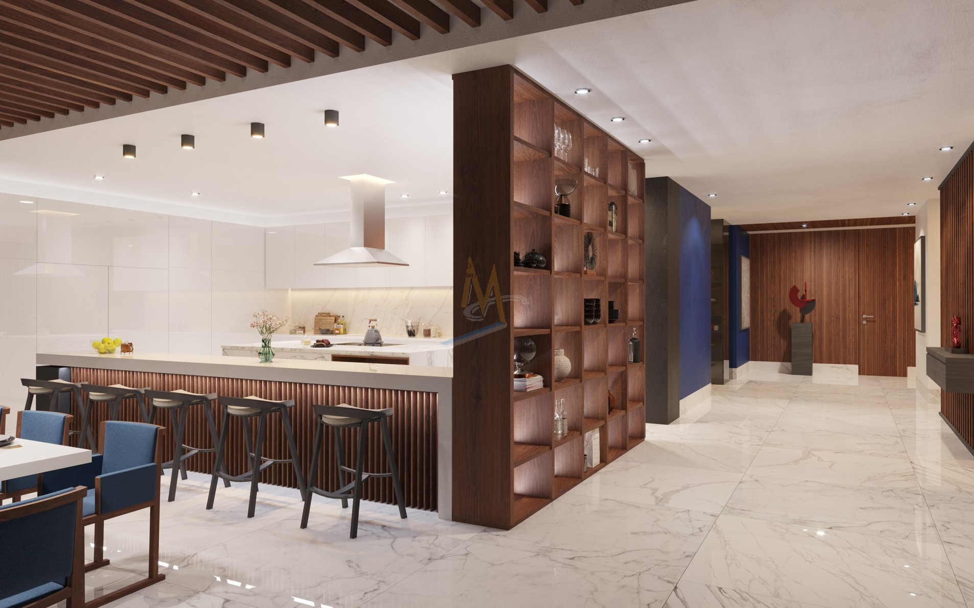 El departamento cuenta con 3 recámaras con baño completo y walk-in closet, cuarto de TV con baño completo, sala, comedor, cocina, alacena, terraza con vista a laguna Bojorquez, terraza con vista a laguna Nichupte, lavanderia, cuarto de servicio, 4 cajones de estacionamiento, jardín privativo de 172 m2 y bodega.